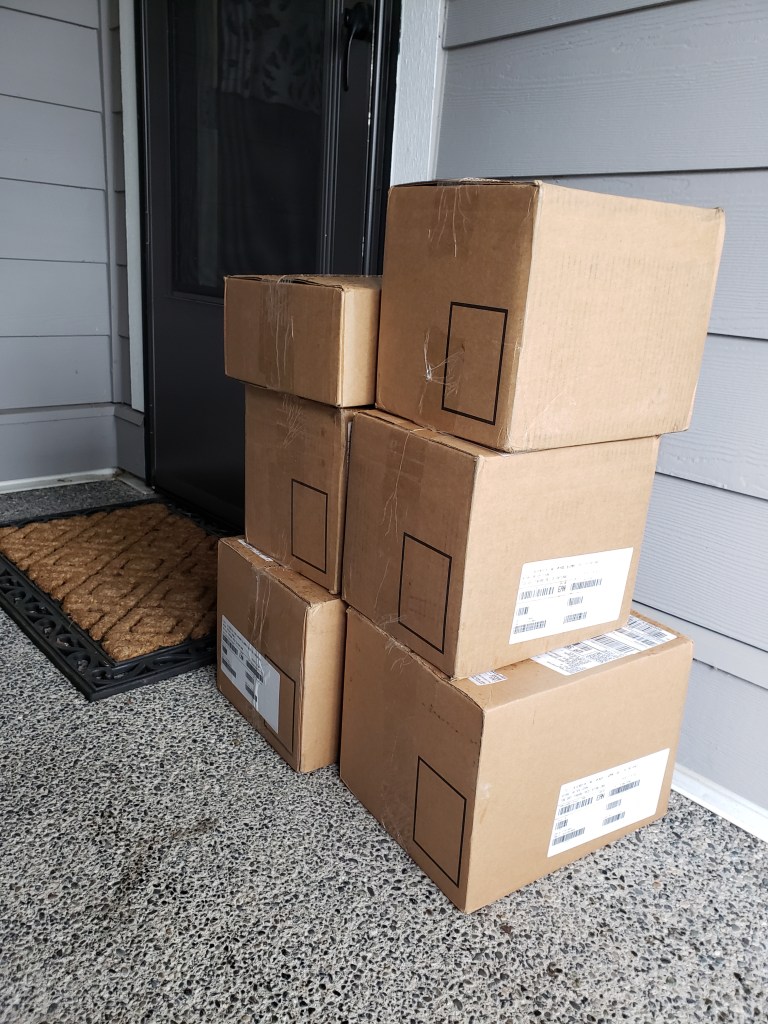 Suddenly there was a flurry of beaks pecking on my door. When I opened it these beautiful pink birds flew away. But low and behold they left six boxes.