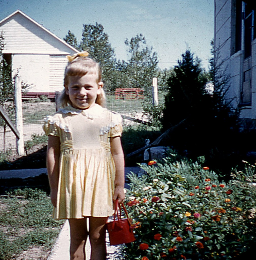 Susan recently discovered this 1954 photo on a View Master slide in a box of old pictures. Here she stood proud one Sunday morning with puffed sleeves, ruffles, and a little red purse. Her curled blonde hair, topped with a yellow bow, made her feel special. At three years of age, the purity and vulnerability of this earnest innocent child is evident.