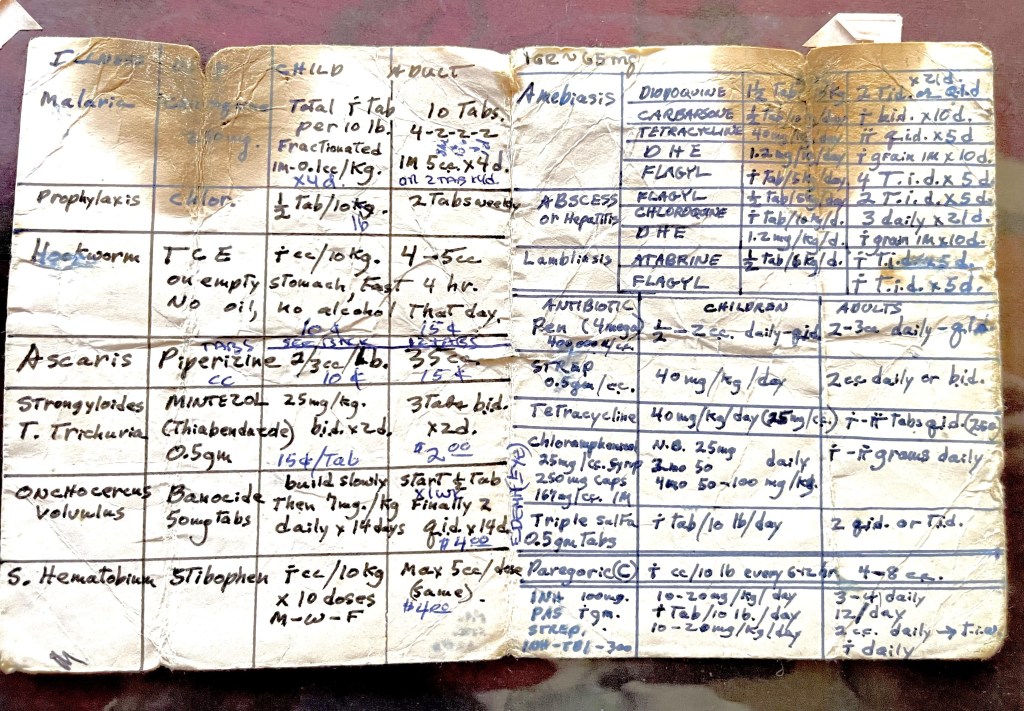 Dr. Mertens wrote a four-by-six-inch reference guide for me containing the common illnesses, parasitic, and bacterial infections that we were able to treat with our limited supplies. The card contained the name of the medication, dose, condition or diagnosis, plus the cost of treatment: fifteen cents for a daily treatment for hookworm or ascaris worms; four dollars for a fourteen-day course of tablets to treat Onchocerciasis volvulus (the cause of “river blindness”). I carried this card with me wherever I went on the hospital grounds, on vaccination treks through the jungle, and on short flights to reach more isolated communities.